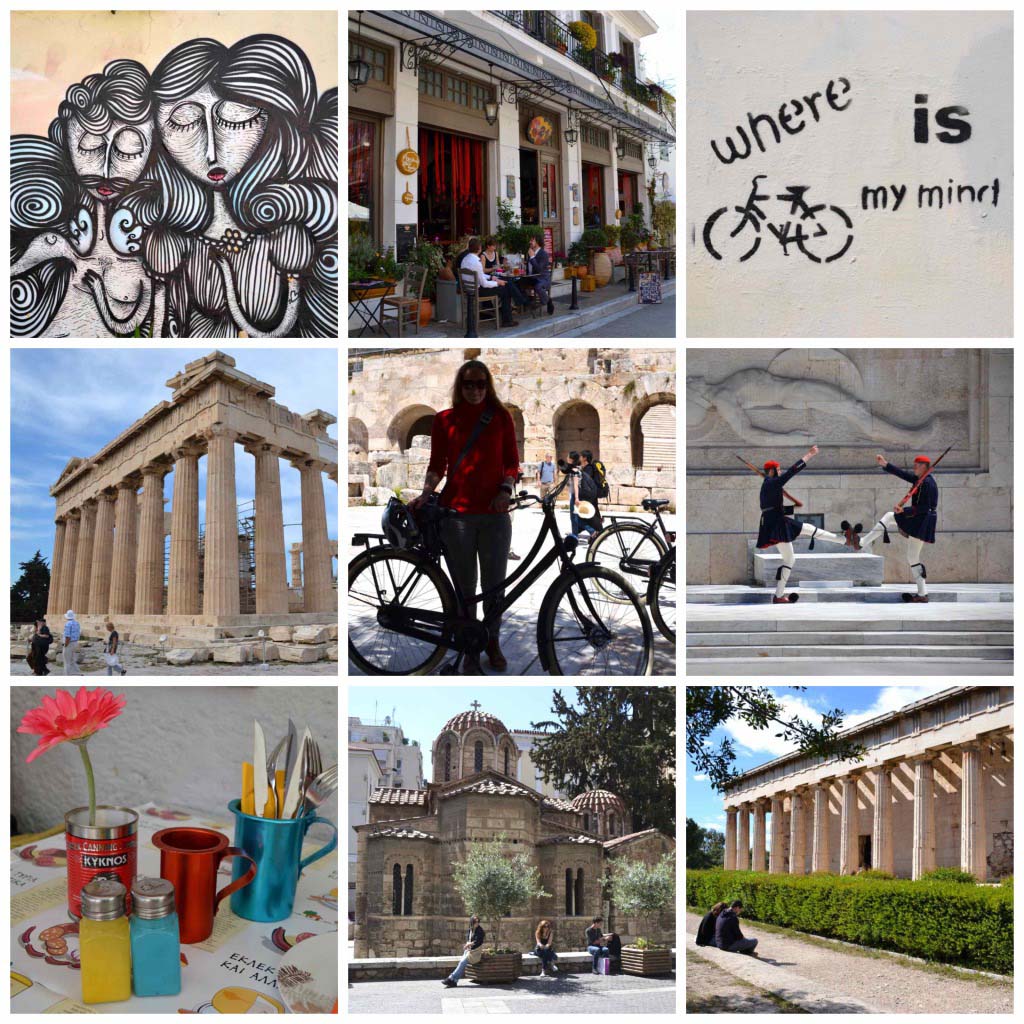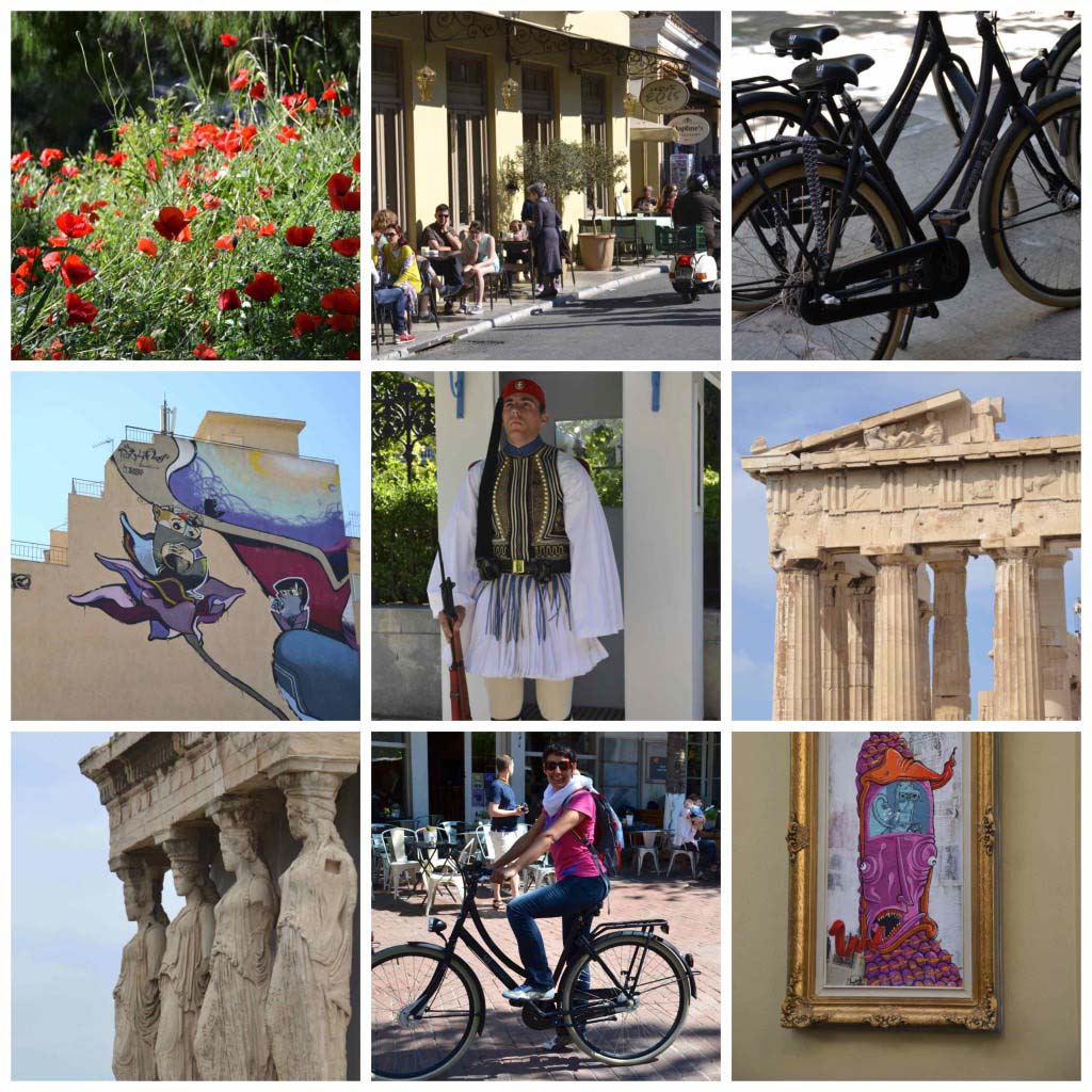 De 3 uur durende tocht begint. De half Griekse, half Nederlandse Iris kent de stad op haar duimpje. Athene is al haar hele leven haar thuis. Een sliert van zwarte fietsen trekt door de straten van de oude volksbuurt Pláka, gelegen aan de voet van de Akropolis. Neoklassieke gebouwen met lichtgele muren en blauwe luiken glijden aan ons voorbij. Vanuit mijn ooghoeken zie ik mensen aan hun koffie nippen op terrassen in de zon.