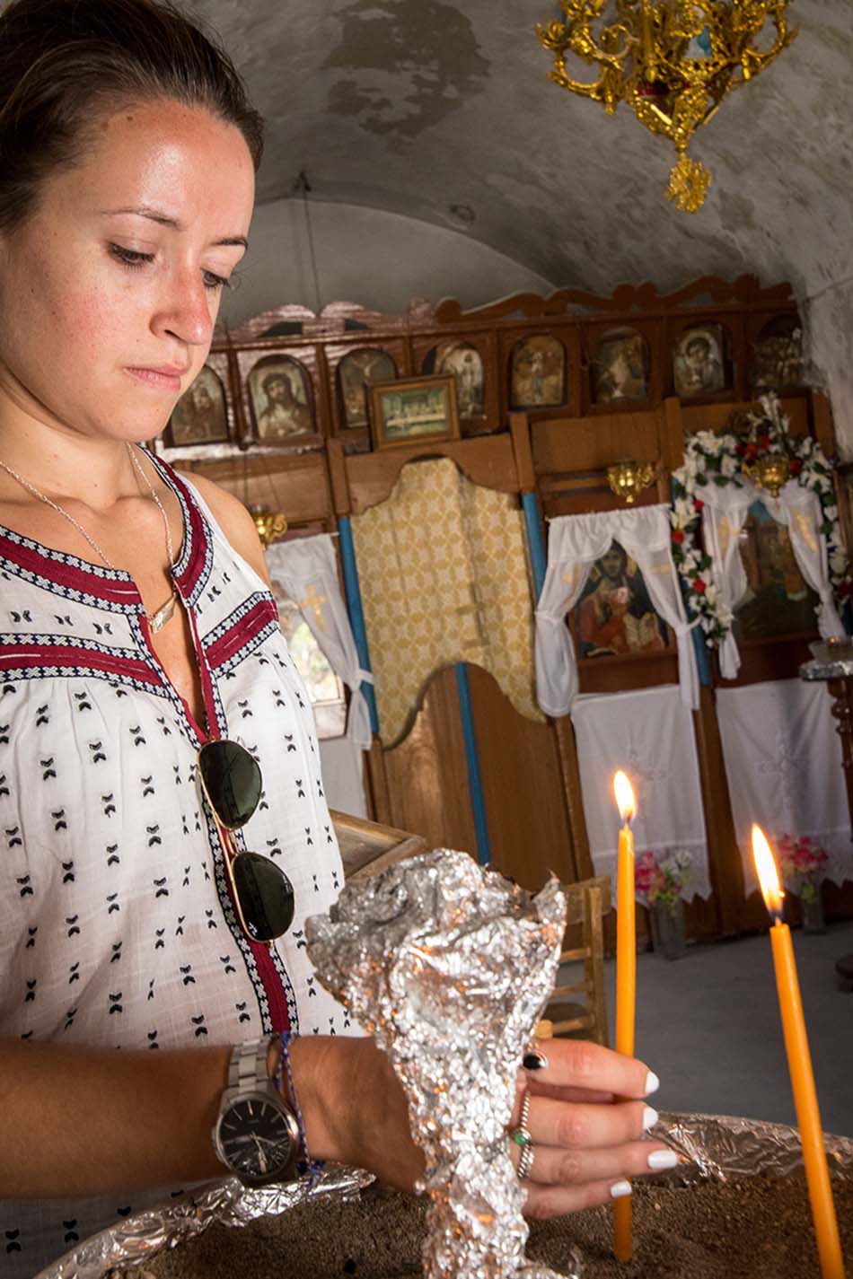 My fifth recommendation is to walk the backstreets of Poros-town, through those narrow alleys that will guide you up the small hills and offer you colourful glimpses of little house yards, mysterious doors, well maintained flowers in pots and beautiful balconies. For sure in those narrow, cool and friendly streets that form a labyrinth of smells and colours, you will find one of these small and beautiful churches with the door half open. Don’t make the mistake of just passing by and not enter that little heaven on earth. All of those churches are well taken care of by the people of the neighbourhood; They are clean and you will always be able to light a candle (please leave some money in exchange for your candle). Light a candle for your loved ones and say a prayer. It’s a moment to feel grateful for being able to return to Poros.