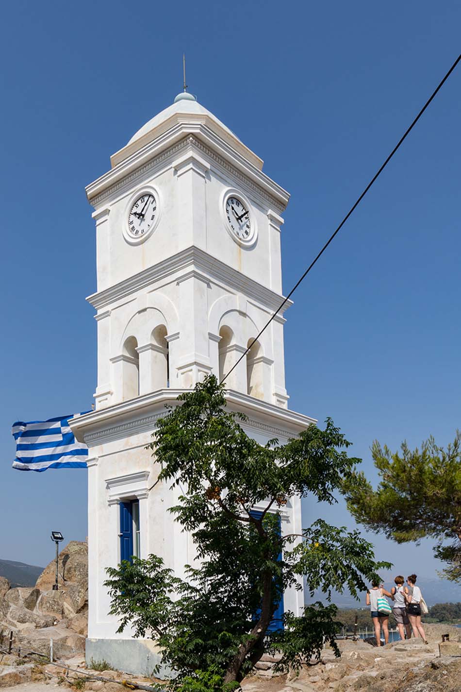One of the nicest things to do on Poros is to walk high up to the clock tower of Poros-town and enjoy the view. I have done that countless times, alone or with friends. It never ceases to amaze me how beautiful the view is up there. Seeing the port and the small boats crossing to Galatas; Be mesmerized by the anchored boats that move on the waves and the luscious green of the pine tree forest of Kalavria (the bigger island of the 2 islands that form Poros). The combination of the green colours and the sparkling blue sea is just amazing.
