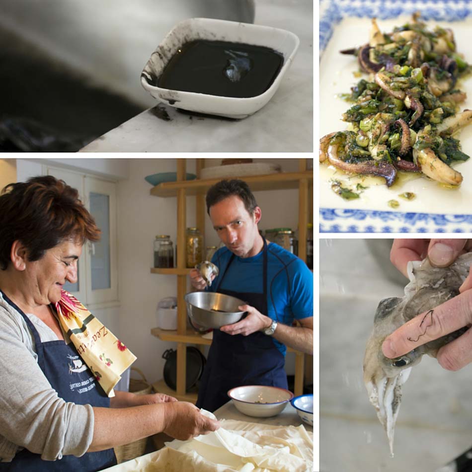 She had also promised a “special” activity for me, and shortly after my arrival at Odyssey I found out what that was: the grizzly task of cleaning a couple of unlucky cuttlefish for the first cookery class. After a prolonged fight, the luckless creatures lay skinned and floating in the water like two wrecked supertankers, surrounded by a slick of black crude oil, as their ruptured ink sacs discharged a black mess over Katerina’s white sink and down the drain. “Don’t forget to save the ink,” she optimistically called from the kitchen……Oh Crikey! My heart sank!