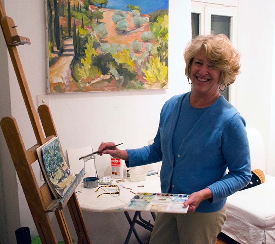 When I visit Pamela’s house in Poros-town to talk about Greekscapes, she and her new love open the door. A picture of the painting mentor that brought Pamela to Greece stands in the living room. After reading in Greekscapes about her development as an artist, it’s so nice to see her studio and some of her beautiful paintings. There are not many, Pamela has sold most of her work. We sit down next to her easel and paint.