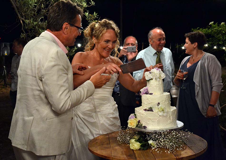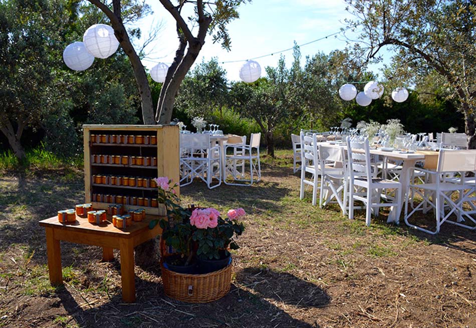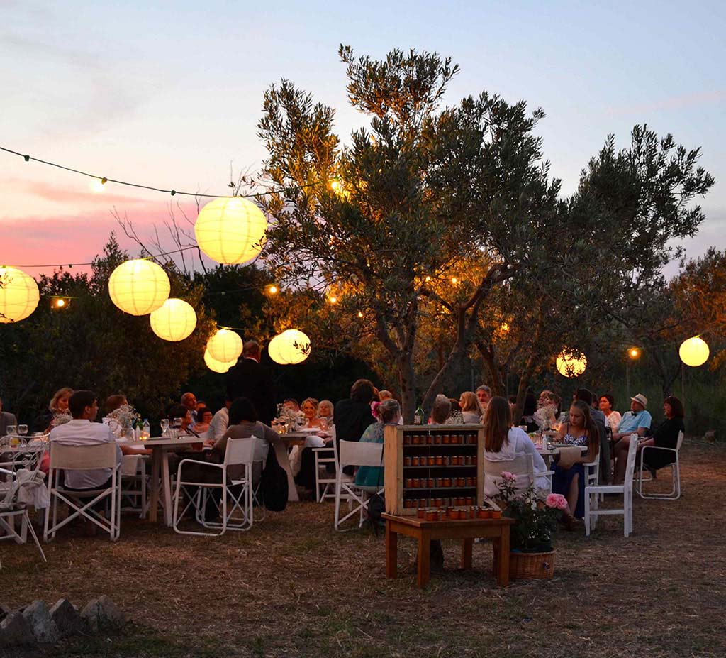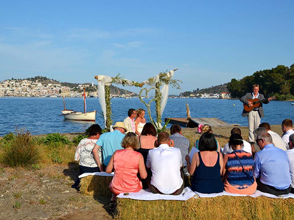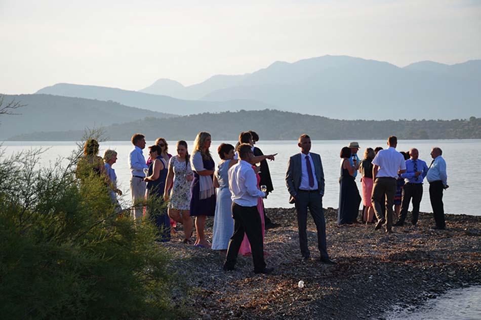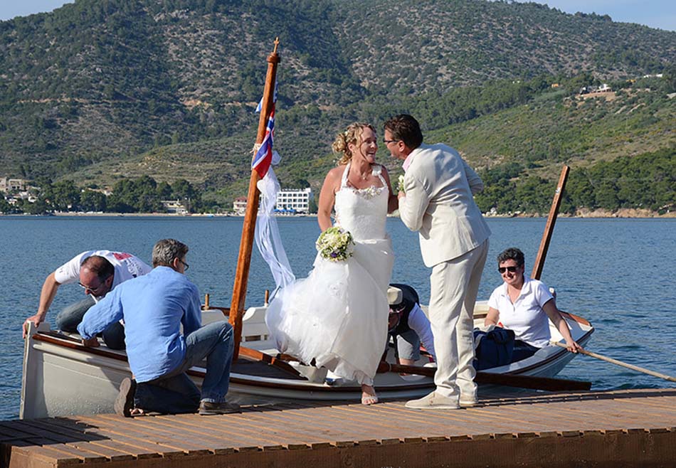 Recently a dream became reality; we had the first wedding ever on my olive farm! The Scandinavian couple Oddney and Tore said their vows next to the sea as their guests watched while sitting on hay bales with Poros town twinkling at sunset in the distance. Both Greek and Norwegian gods seemed to be in the best of moods on the big day. The sky was bright blue, the sun beaming and the air was calm. After a week of feasts at the Odyssey, Greek dancing under the stars, spa treatments, relaxing at the beach and discovering charming Poros, the 50 guests were waiting with anticipation and excitement as they departed for the wedding in the little taxi boats. The groom was eagerly waiting on the farms dock.