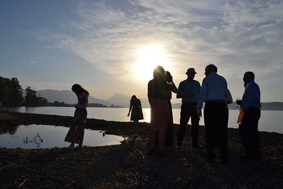With lemon cocktails in hand the guests were all peering through the olive branches to catch a glimpse of the brides arrival by boat.