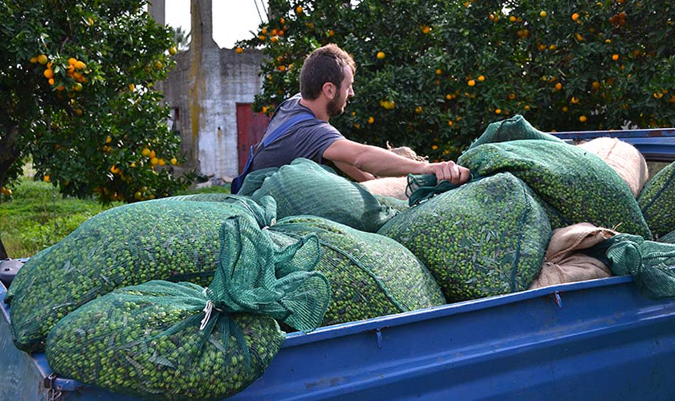 When the olive trees have been harvested, an olive pressing factory picks up the bags.