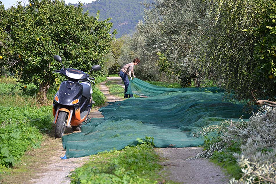 Before we start picking the olives, we first lay nets down under the olive trees. We each get a little rake and ‘comb’ the olives of the branches.