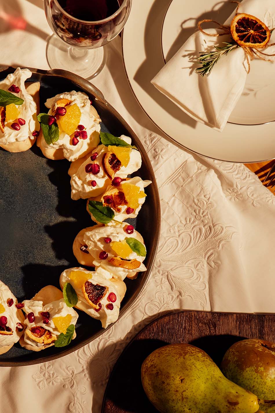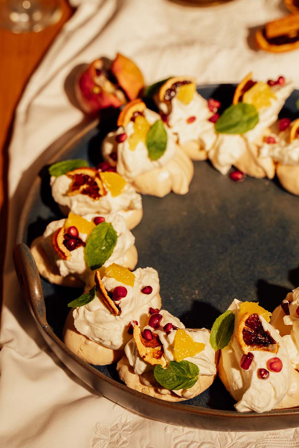 the pillowy whipped cream, the pomegranate seeds look like tiny red rubies and the pistachios and mint look like emeralds. It’s a literal edible wreath that doubles as your table’s centerpiece.