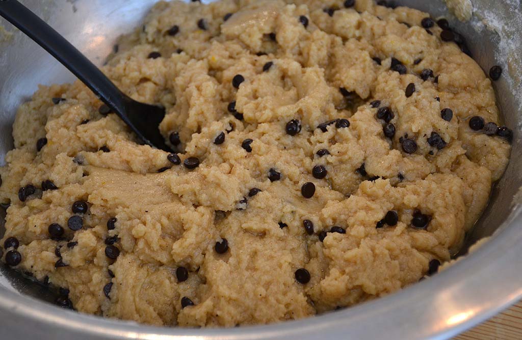3. Combine spices with flour, then slowly stir dry ingredients into the bowl. When completely mixed, stir in chocolate chips.
