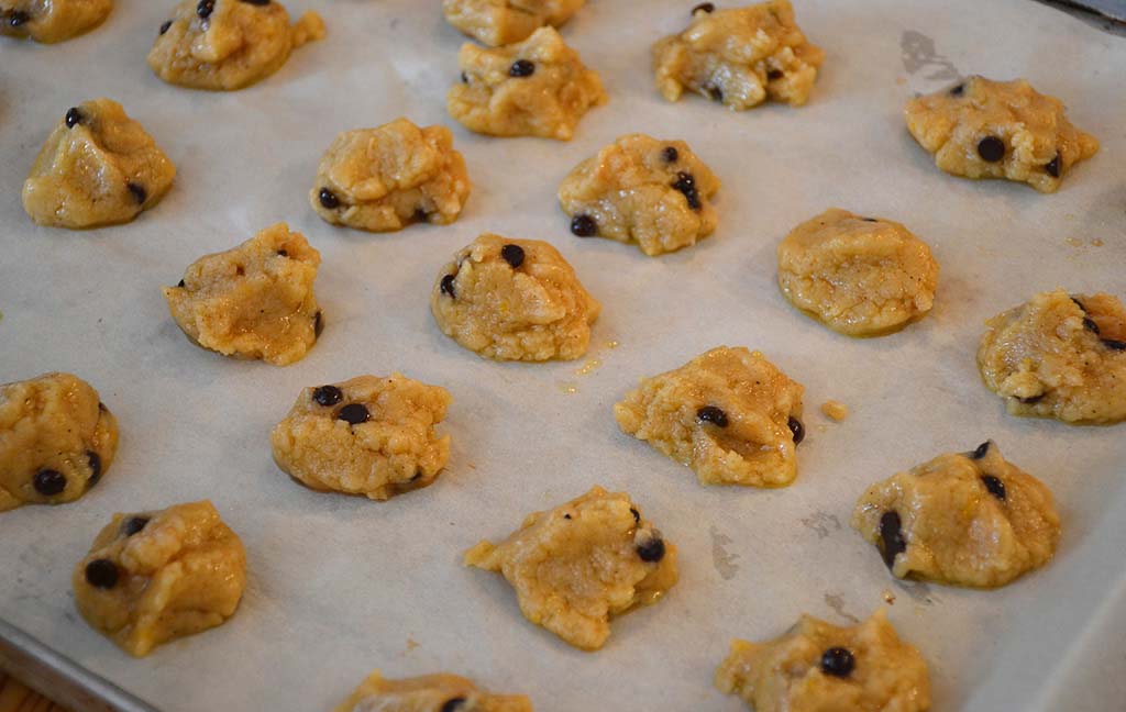 4. Cover two baking trays with baking paper. Using two tablespoons, scoop cookie dough and transfer to baking sheets (use the second spoon to push off the mixture). Space cookies as they will rise a little and spread.