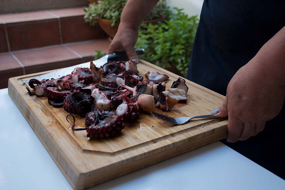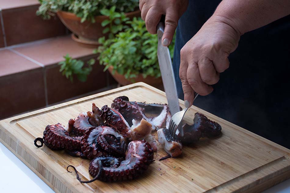 Making cooked octopus with red wine vinegar