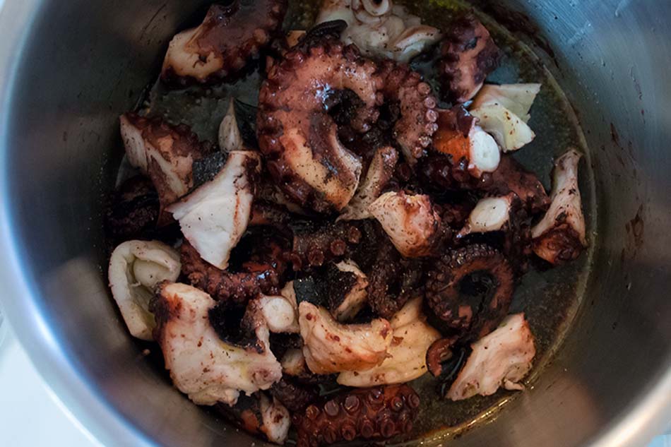 5. Deglaze with the vinegar and wait for it to evaporate. Pour in the juices from boiling the octopus, that you have kept aside. When cooked nicely, the octopus should be crunchy.