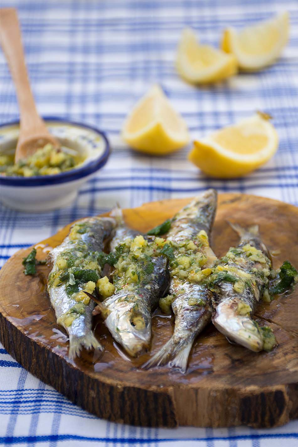 4. Serve the sardines with the lemon-mint sauce on top.