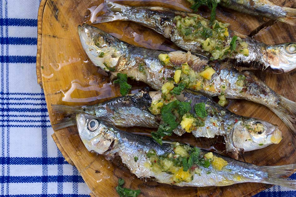 During my childhood my mother used to prepare sardines in the most wonderful way. She would make grilled sardines on the barbecue or fry the fish in olive oil with some horta (edible plants). It was the ultimate summer food! We needed nothing else, it was fantastic! Fair enough, sometimes we would finish the meal with nice and cool watermelon to ‘clean our mouths’, as my parents said. On top of that, we did not have to keep anything for the cat…