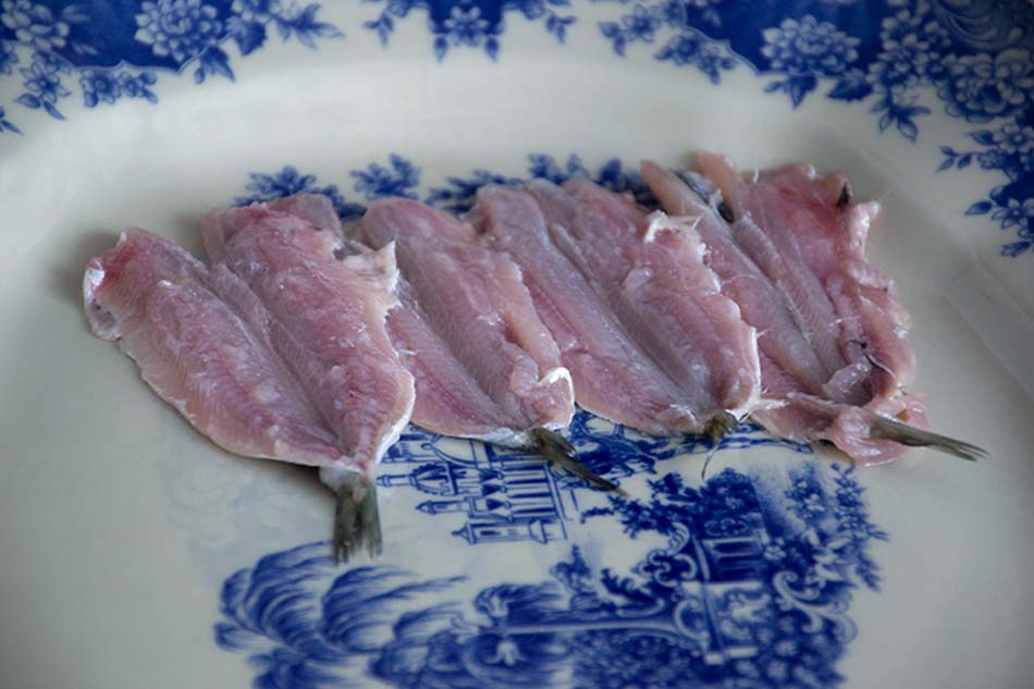 1. Cut the anchovies and place them in rows next to each other on the bottom of a shallow dish (Like in the pictures of this blog).