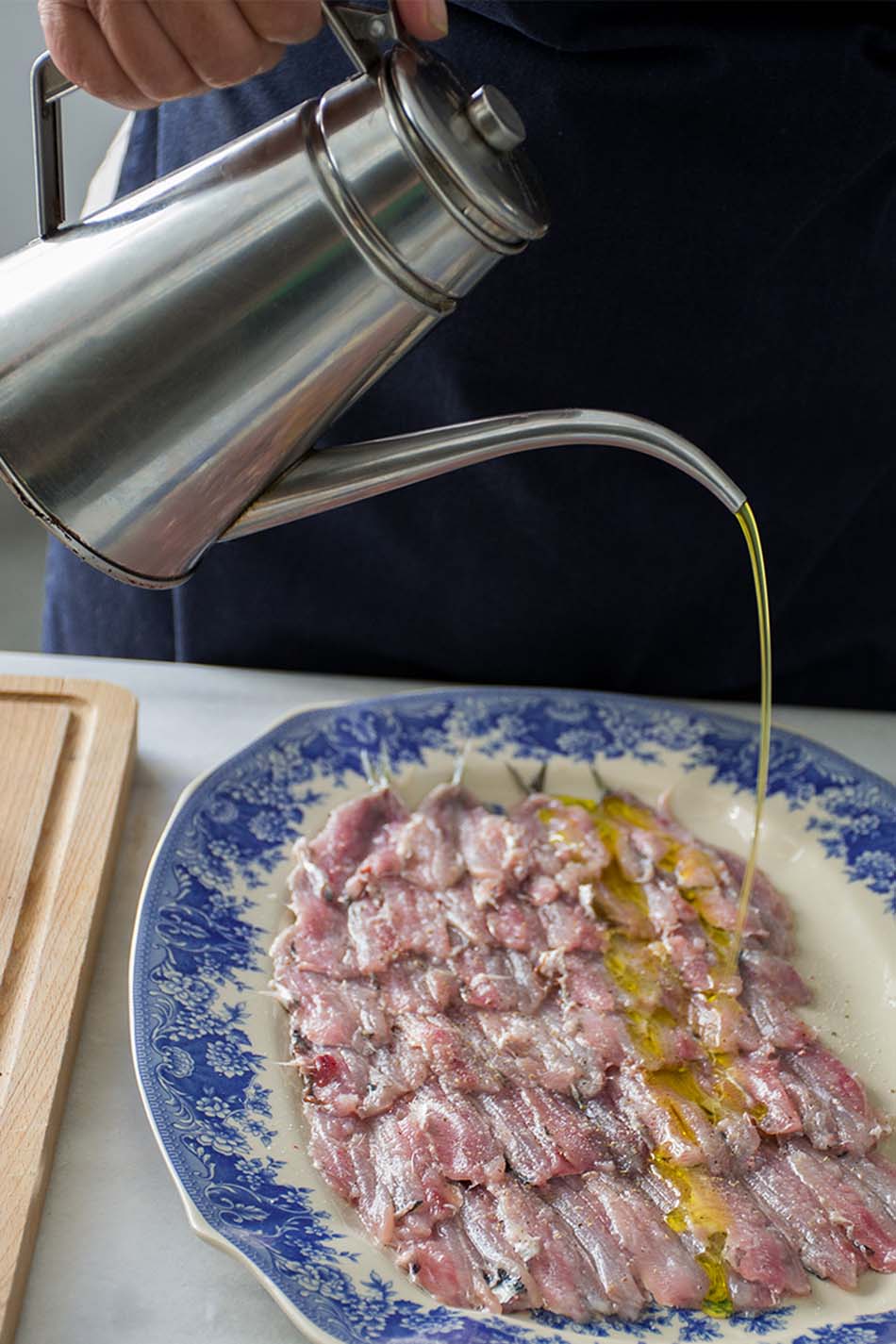 And pour the lovely olive oil over the anchovies.