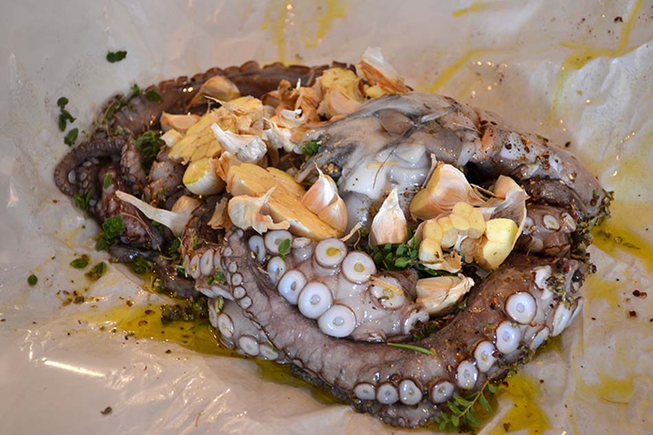 Here is a very special recipe with octopus: Octopus Kleftiko. This dish is a starter, simple to make and really delicious. What is very unusual about it is the preparation method, you will see why! First cut 3 pieces of baking parchment and place them one on top of the other. Lay the paper in a roasting tray, with one half on the base of the tray and the other half hanging over the edge. Place the octopus on to the paper. Add the garlic heads cut in half, sprinkle with the herbs and all the spices, the lemon juice and the olive oil and season it with salt and pepper.