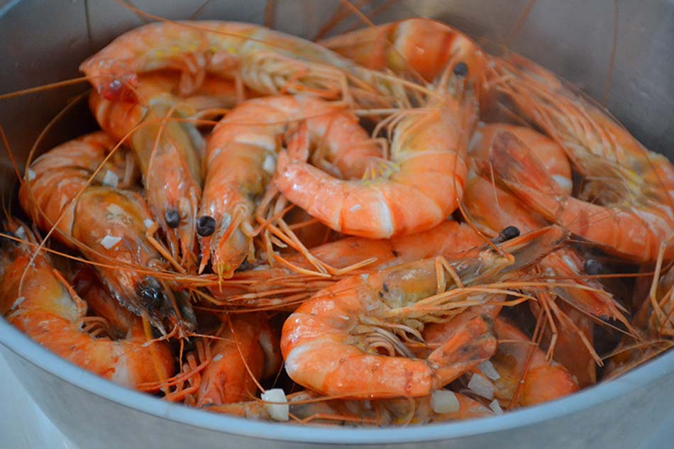 1. In large skillet type pan, heat 4 tbsp of the olive oil and then add prawns. After turning the prawns once take them from the skillet and lay them on a plate to cool and then shell all the prawns. Keep the shells for the stock and leave the oil in the skillet for the moment.