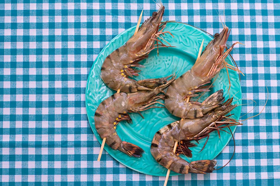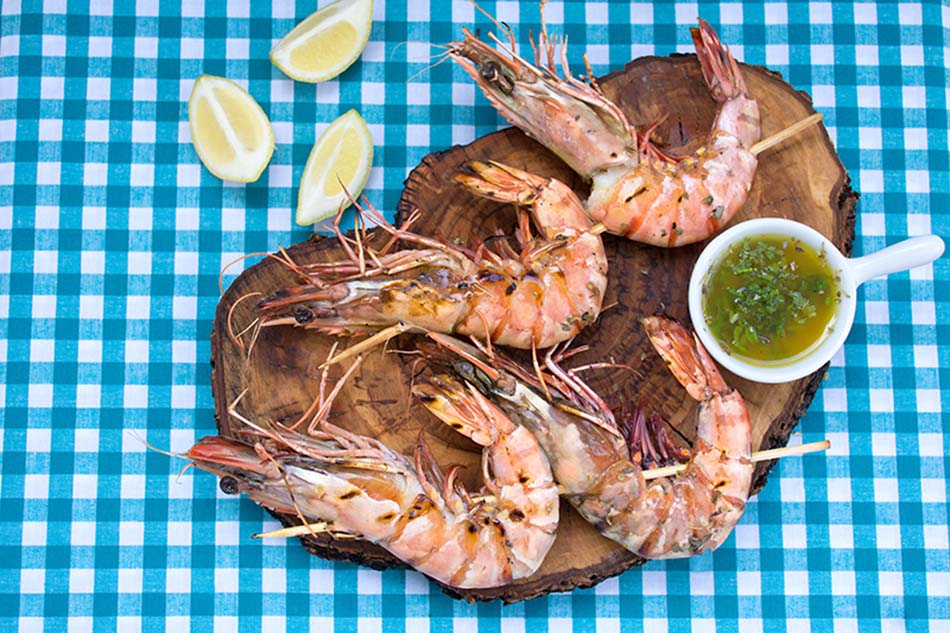 3. Pass the skewers through the prawns. Turn on the barbecue and when it’s hot, place the skewers on the grill. Brush them with the Ladolemono-dressing. Turn them around and brush them again. Grill for approximately 1 minute on each side until the prawns turn pink.