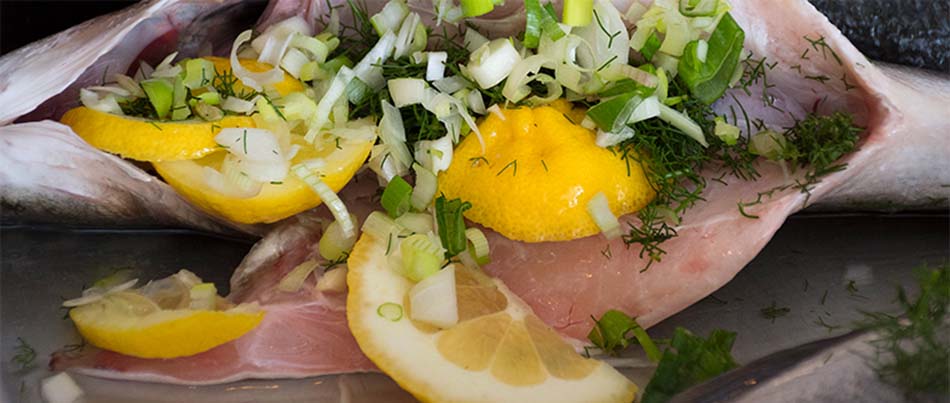 The fish is now in an oven dish. Chop the onions, dill and root fennel and cut 2 lemons in small pieces. Stuff the inside of the fish with these ingredients and the parsley and add some pepper. If you have any herbs left, you can also add these to the oven dish!