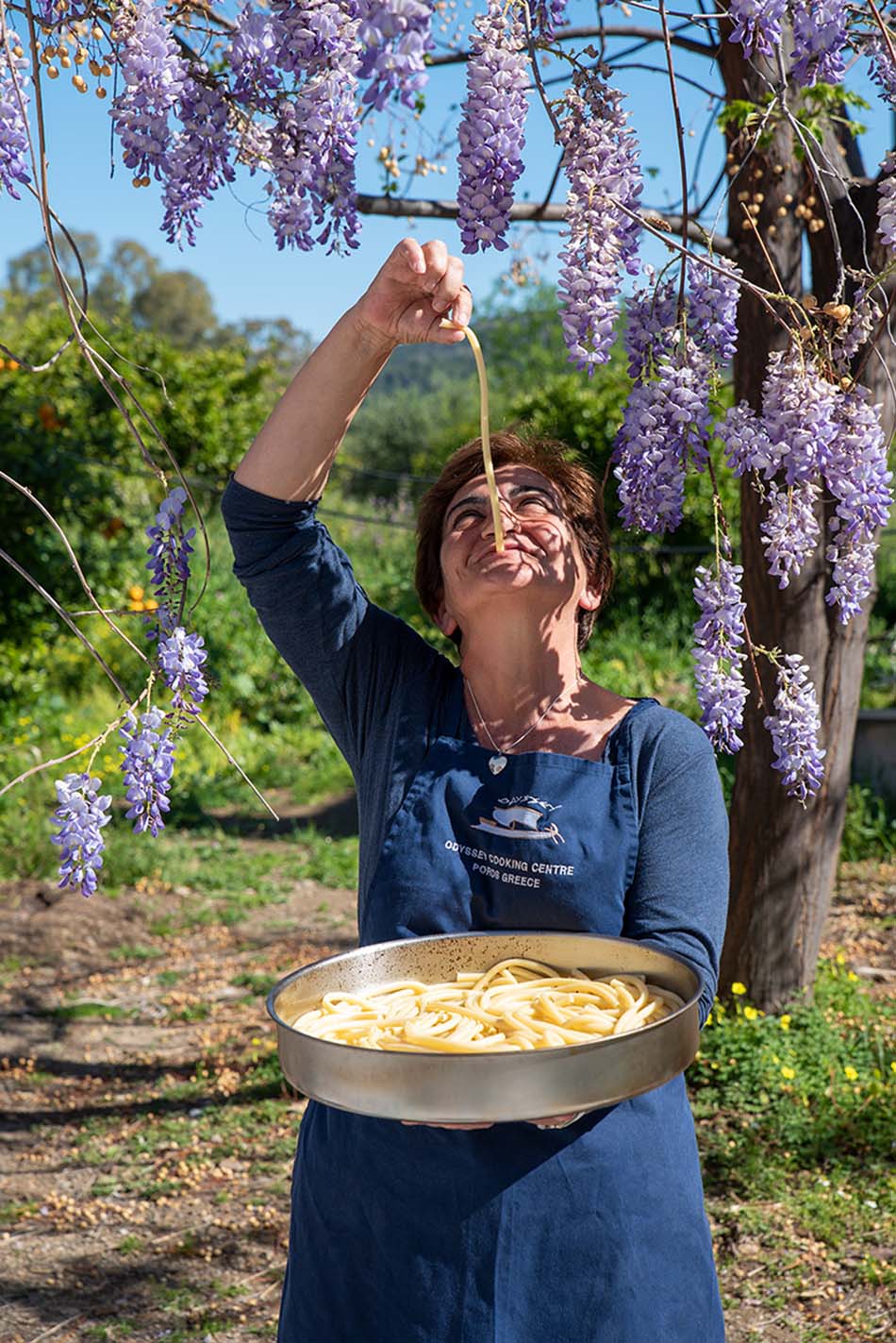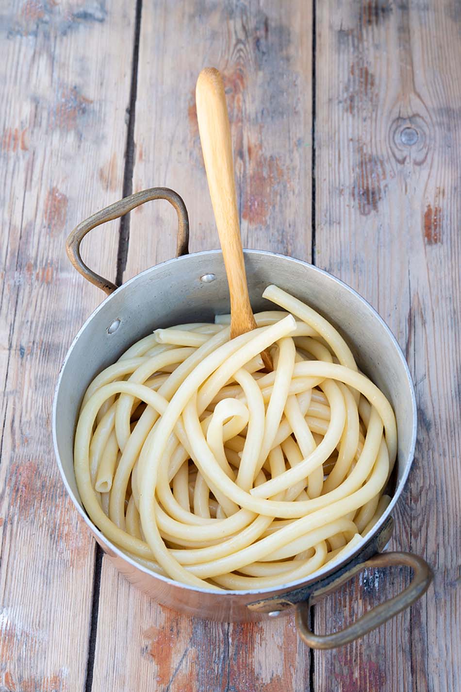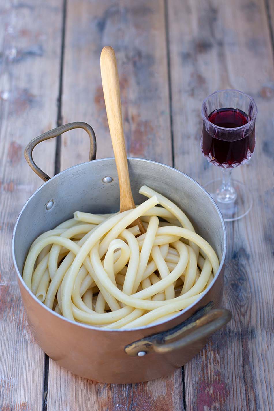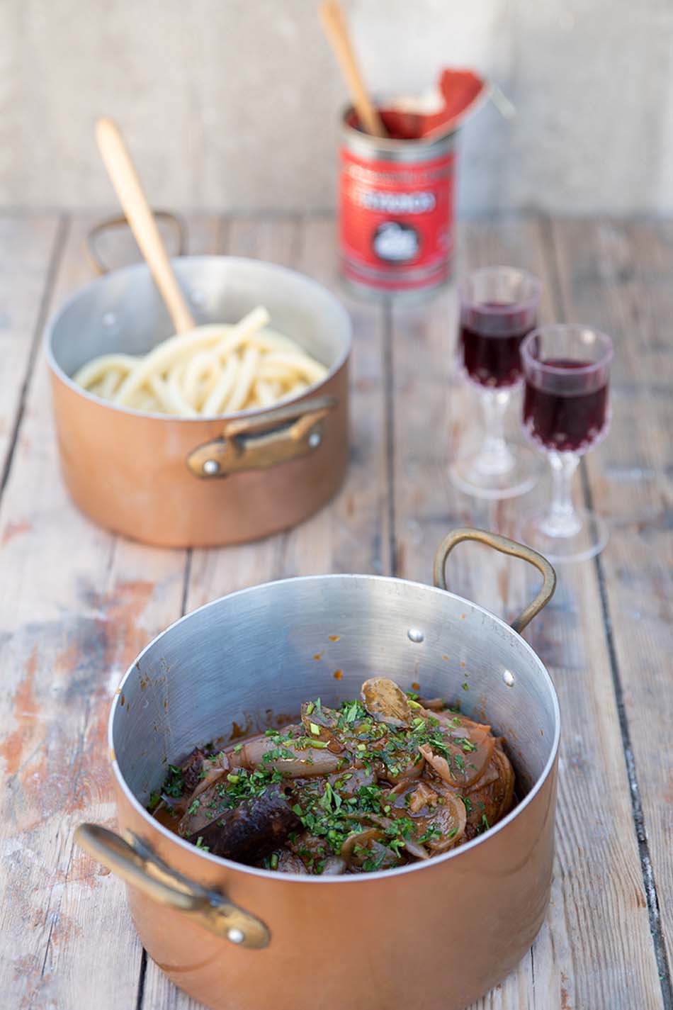 For the chicken in red wine sauce I have used the Greek macaroni called Bucatini. With this pasta we also make Pastitsio. We consider it the perfect side dish for a lot of tomato-meat sauces. Try to find Bucatini, as this pasta has a very special taste and is very interesting to look at on the plate!! Bucatini is bigger and thicker than the average macaroni and because of that, I think it absorbs more of the sauce and makes it very tasty.