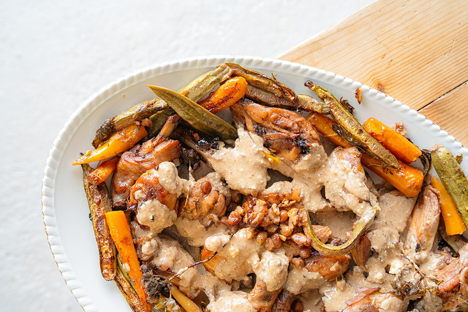 This recipe makes the most tender chicken, covered in a sauce that’s sweet, savory, and a little bit tangy. And the roasted walnuts and plump raisins make it extra, extra good.