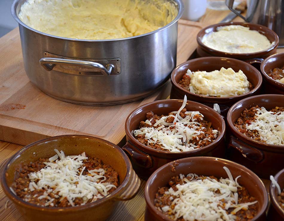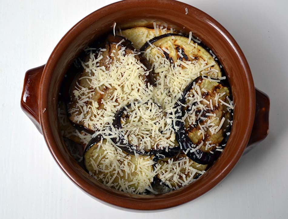 Cover an oven proof dish with a third of the potatoes, eggplant slices and the beef mince. Sprinkle with the kefalotiri and repeat the layers. Finally add the béchamel sauce on top and finish it up with a last sprinkling of kefalotiri.