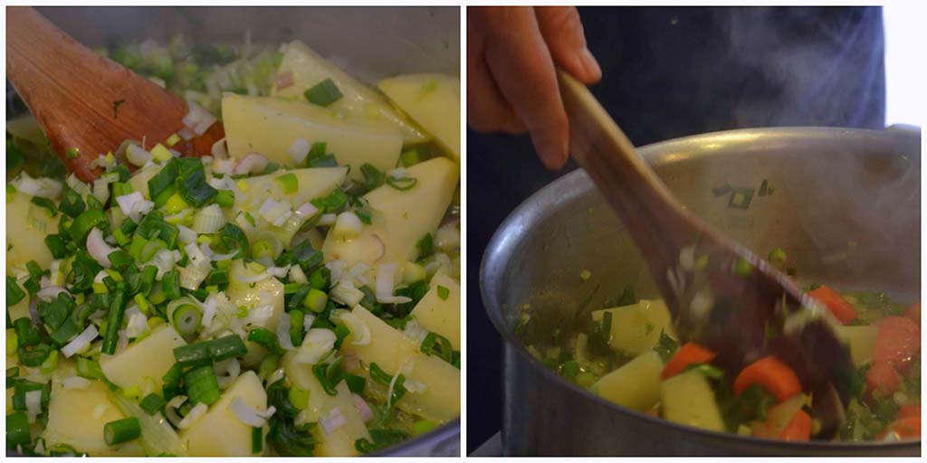 1. Place prepared artichoke hearts, carrots and potatoes into a bowl. Add only enough water to barely cover. Squeeze in the juice of one lemon. Reserve water for later use.