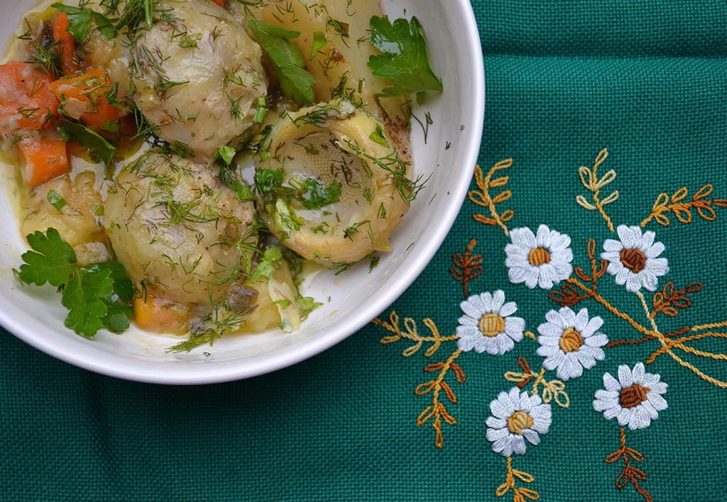2. Heat one cup of oil in a deep wide pan. Add onions, artichoke hearts, carrots, potatoes, and ½ of the dill and stir. Slowly add reserved artichoke lemon water to add moisture to cooking vegetables. Add salt and pepper to taste. Leave to cook until everything is soft.