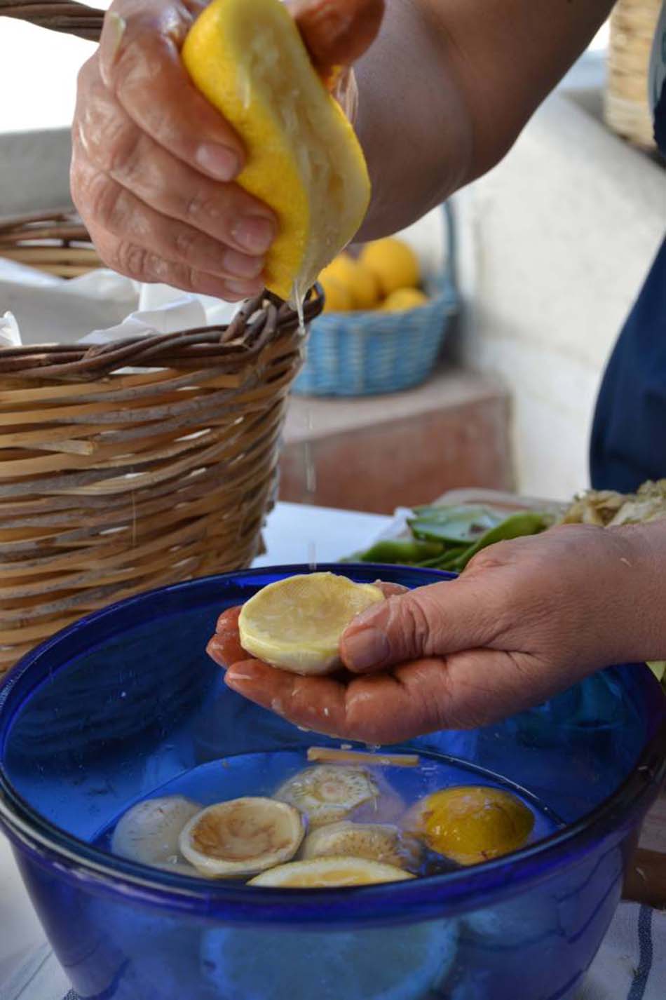 To prevent the artichoke hearts from turning black, put them in a bowl with water and lemon.