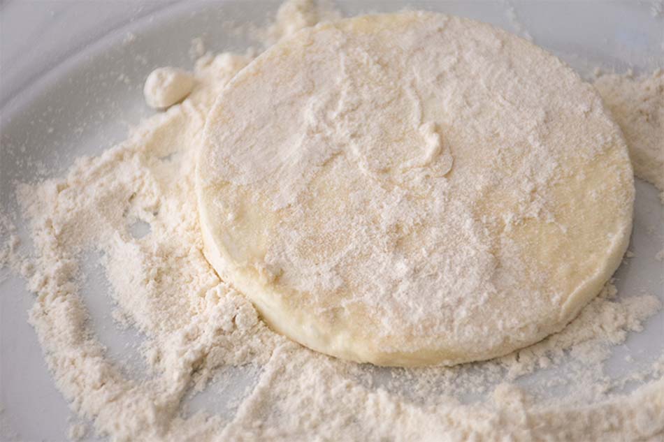 1. Wet the slice of cheese in water and put it in the flour. Shake to remove the excess flour.