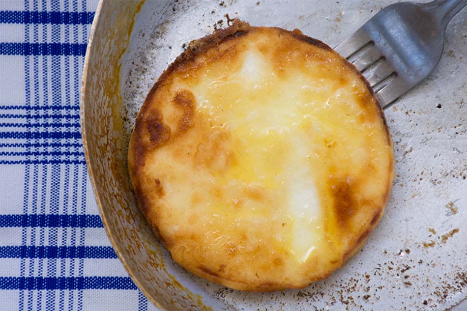 In a pan (if you don’t have a saganaki use a frying pan) heat the oil over medium heat. Carefully place the cheese in the pan for 2 minutes or until it is golden brown. Turn the cheese around to fry the other side the same way.