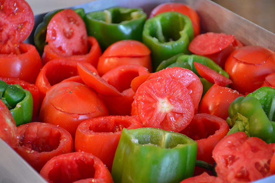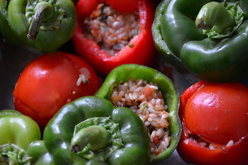 Gemista literally means stuffed. To make this dish you can stuff all kinds of vegetables. In the future you will find more Gemista recipes on Katerina’s Kouzina, not only with different variations to the vegetables, but also to the feeling. Now let’s get some of these deliciously fresh tomatoes and peppers and start cooking!
