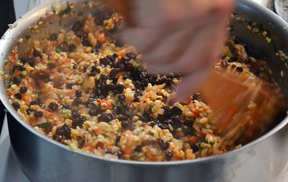 Prepare the stuffing with the rice, zucchini, eggplant, peppers, parsley, mint, raisins and the tomato mash. Don’t overcook it. The rice should not be soft, because it will soften later during the baking time.