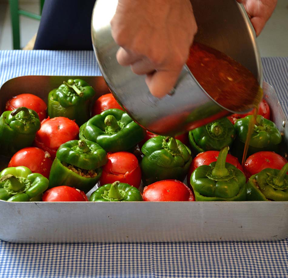 Arrange the stuffed vegetables in a baking dish and drizzle them with a little olive oil, the rest of the tomato mash and some water. Bake them in the oven for 50 minutes.