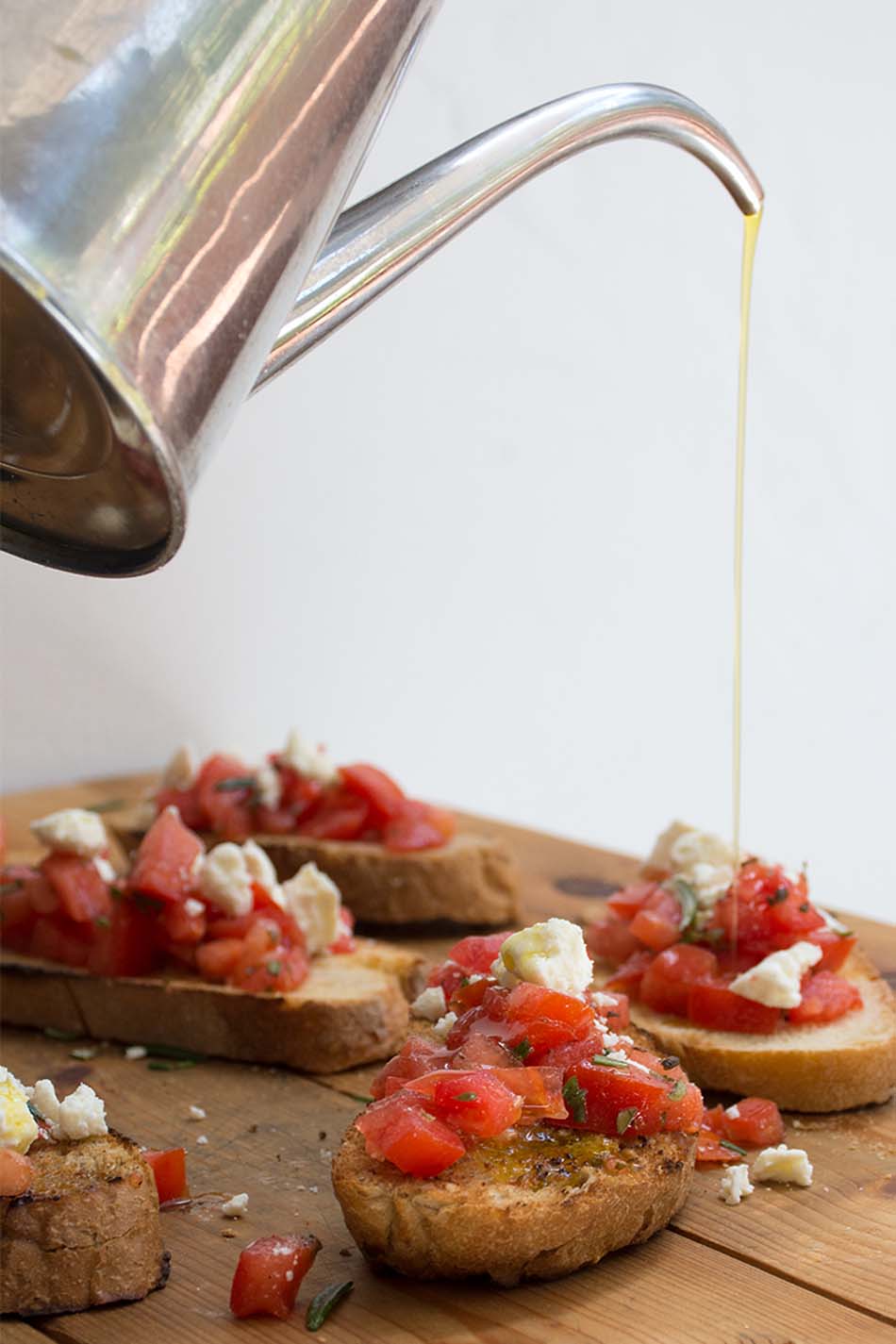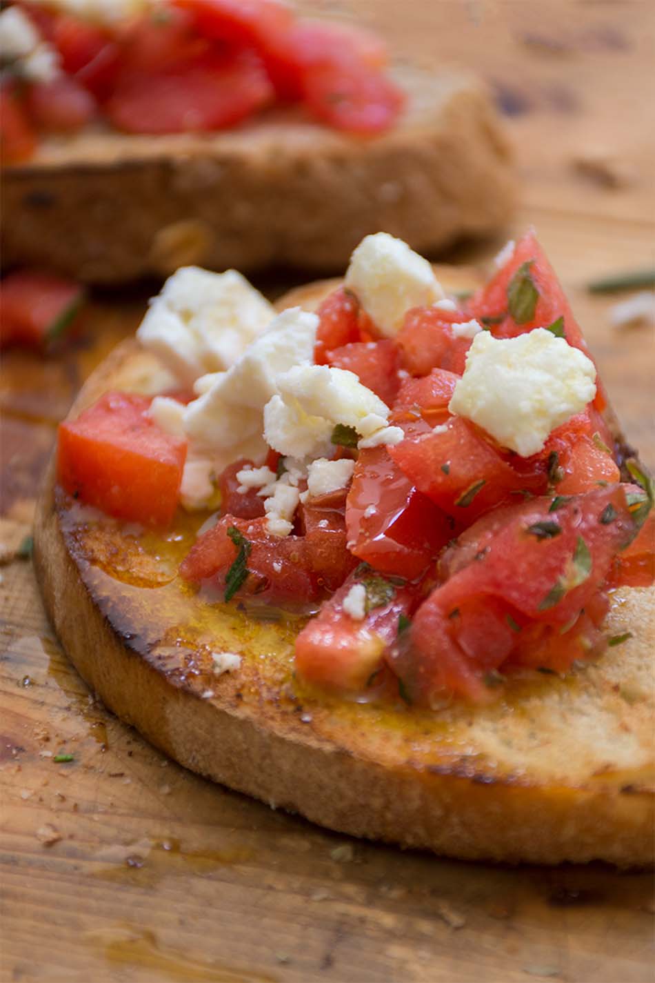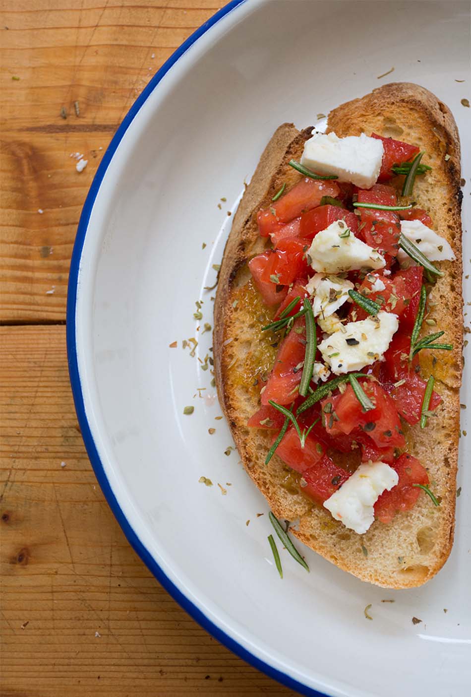 To make the Greek crostini, take 4 slices of artisan bread from the day before. If possible, the best way to grill them is on a barbecue. It would be great if you can get some fresh tomatoes, rosemary and oregano. Mix them in a bowl with feta (cut in cubes) and olive oil and season it all with pepper. Put the mixture on the grilled bread with a spoon, top it up with some olive oil, and you are ready to serve this delicious summer food!