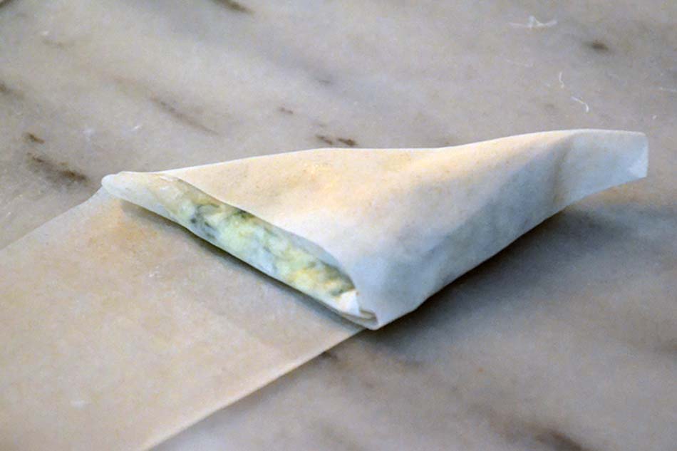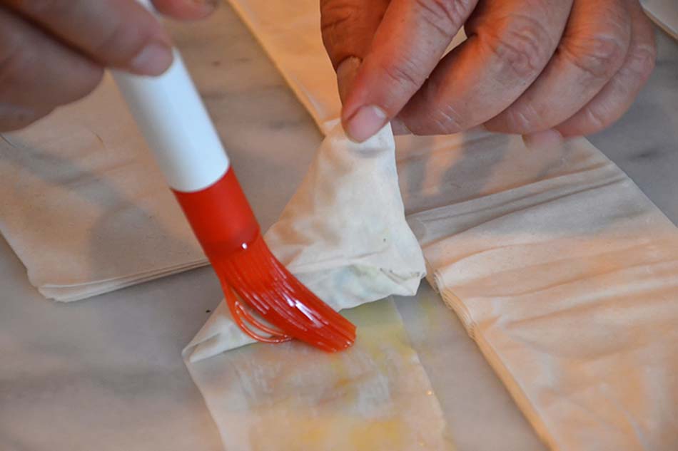 Cut the layered filo pastry into long strips about 5 cm wide. Lay out one strip of filo at a time on your work surface with one of the narrow ends close to you. Place a tablespoon of filling on the end nearest to you. Fold the bottom right corner over the filling to the left edge to form a triangle.