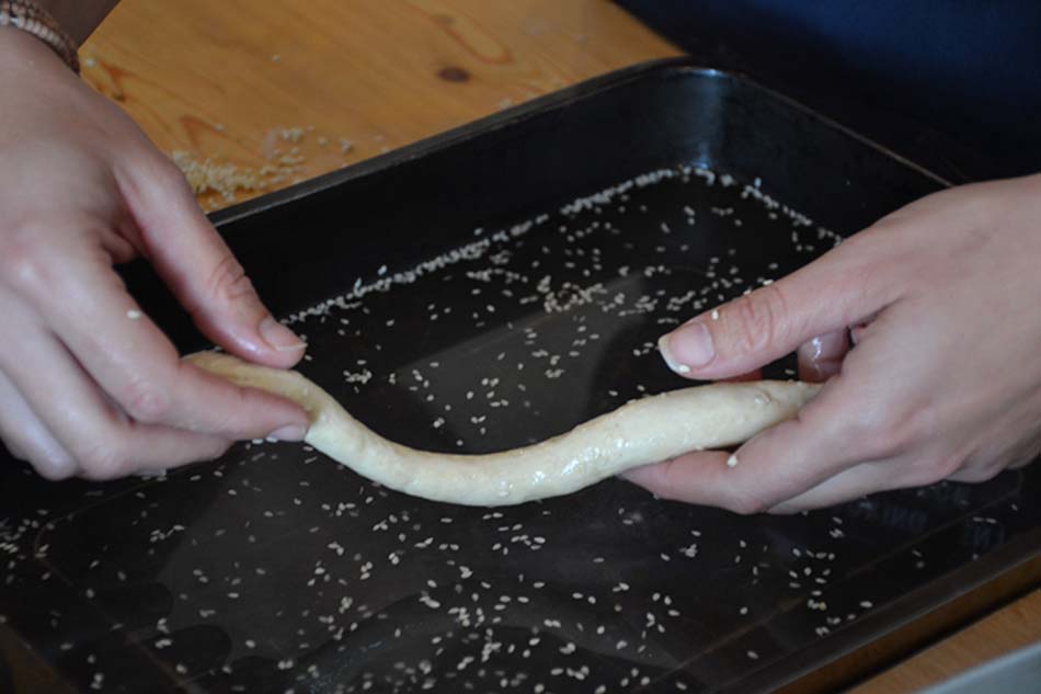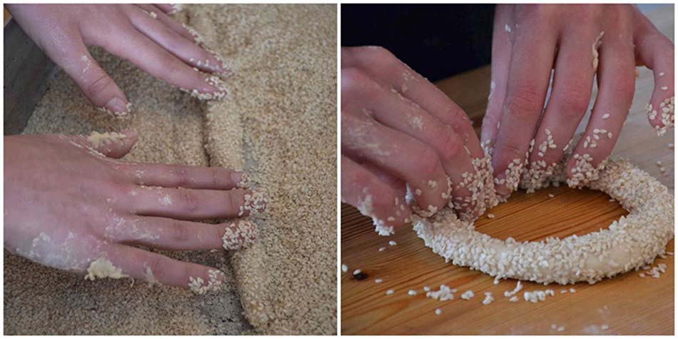 Knead each ball into a sausage shape, carefully dip them into the sugar water and then into the sesame seeds. Gently turn ends towards each other to form a circle or koulouri. The rings should be roughly the same size.