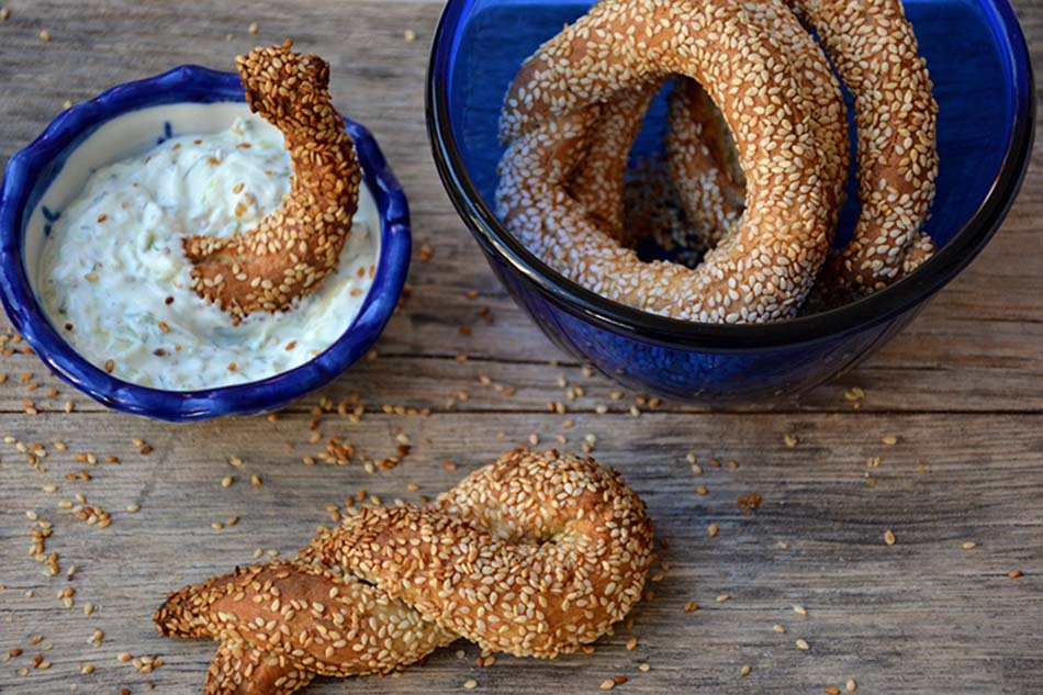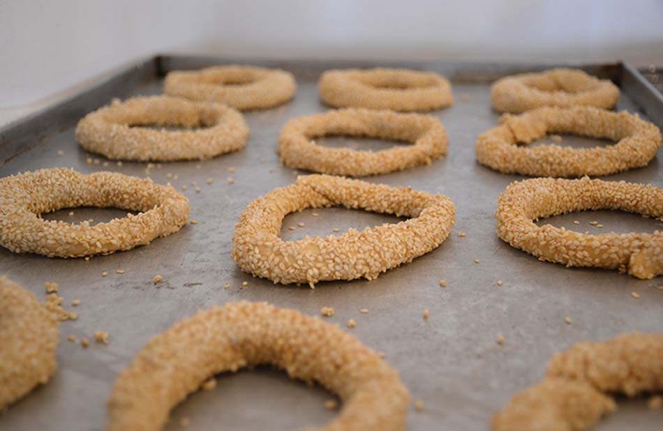 7. Carefully dip each ring into the sugar water and then into the sesame seeds. Place koulouri on a baking sheet lined with paper and bake for 15-20 minutes until golden brown. (For deeper flavor and softer texture, add 2 tablespoons tahini to the dough.)