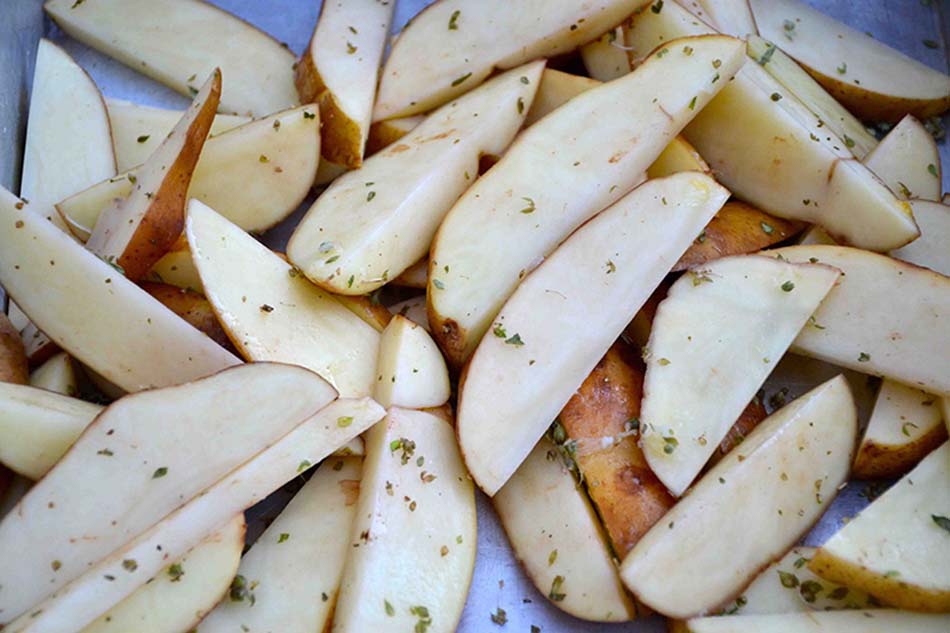 We start this recipe by cutting the potatoes into large pieces – like wedges – and place them on a metal roasting pan.