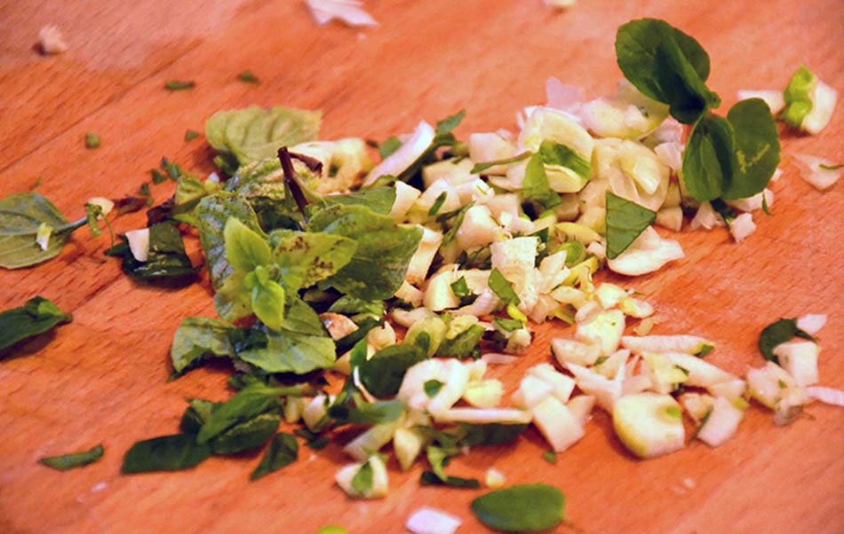 Cut the fresh oregano and the garlic. I sometimes add fresh basil, just to give a twist to this classic Greek recipe.