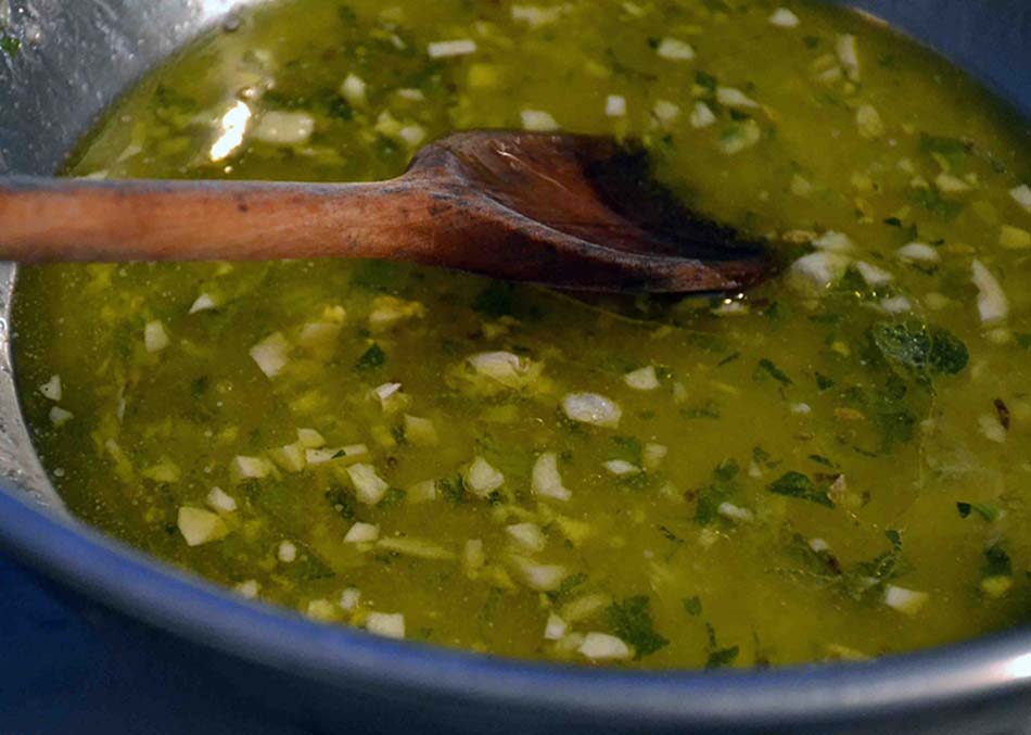 Mix the herbs and the garlic together with the oil, wine, juice of the lemons and the orange, the mustard and salt and pepper.