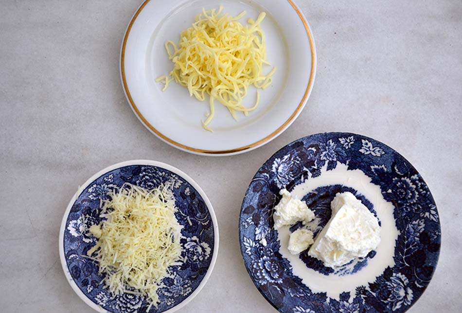 2. Mix the feta, anthotiro and kefalotiri cheese, the dill, the parsley and the hot pepper or Tabasco with a fork. Add salt and pepper to taste.