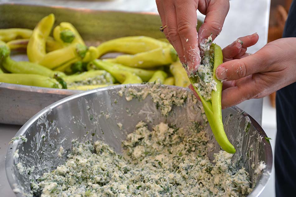 3. Make a round hole at the top end of each pepper and fill them with the cheese mixture.