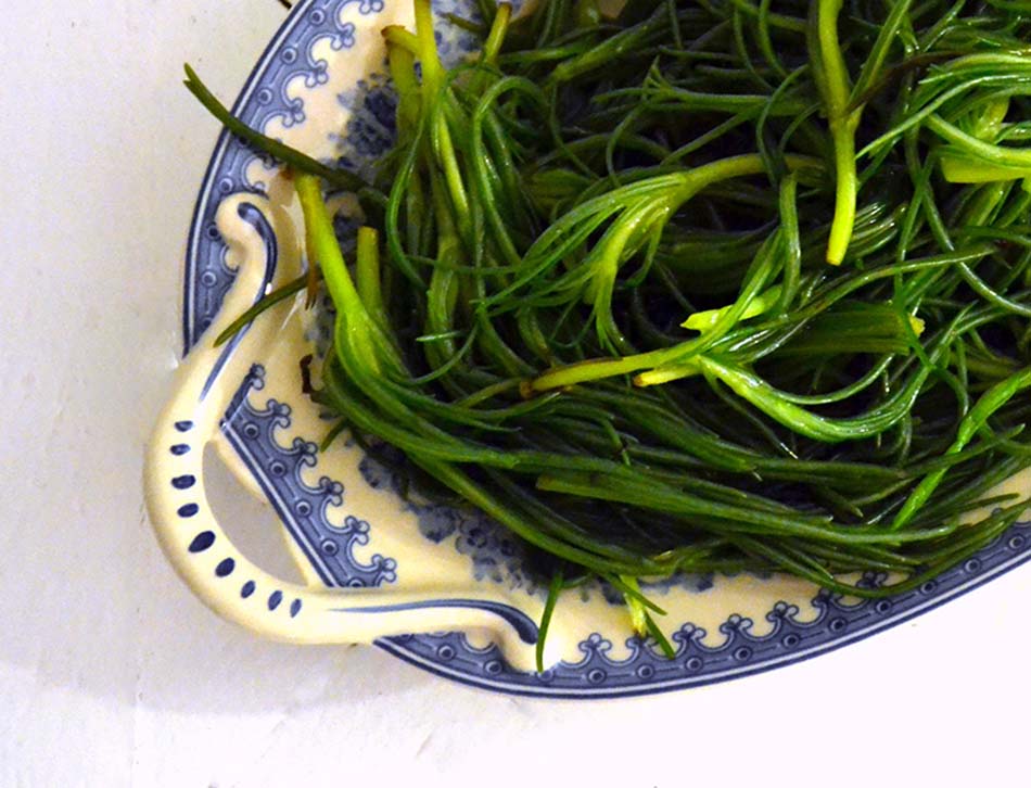 This salad is a special treat. What follows isn’t so much a recipe as instructions for preparing salt cedar – and is so simple that my mother and her friends burst out laughing when I asked them for the ‘recipe’. But the taste is no laughing matter!